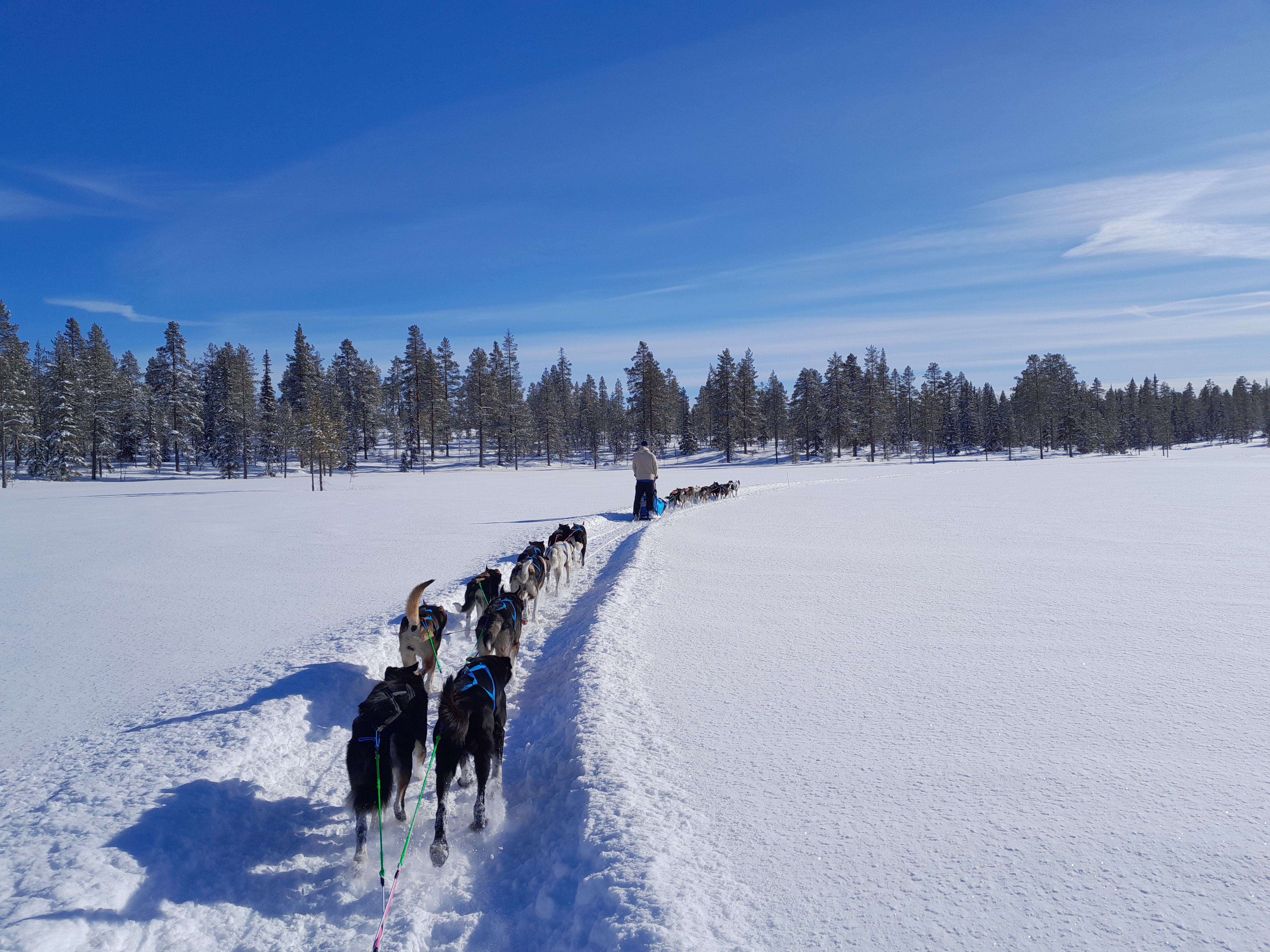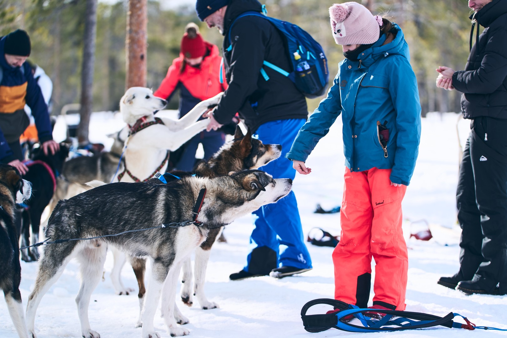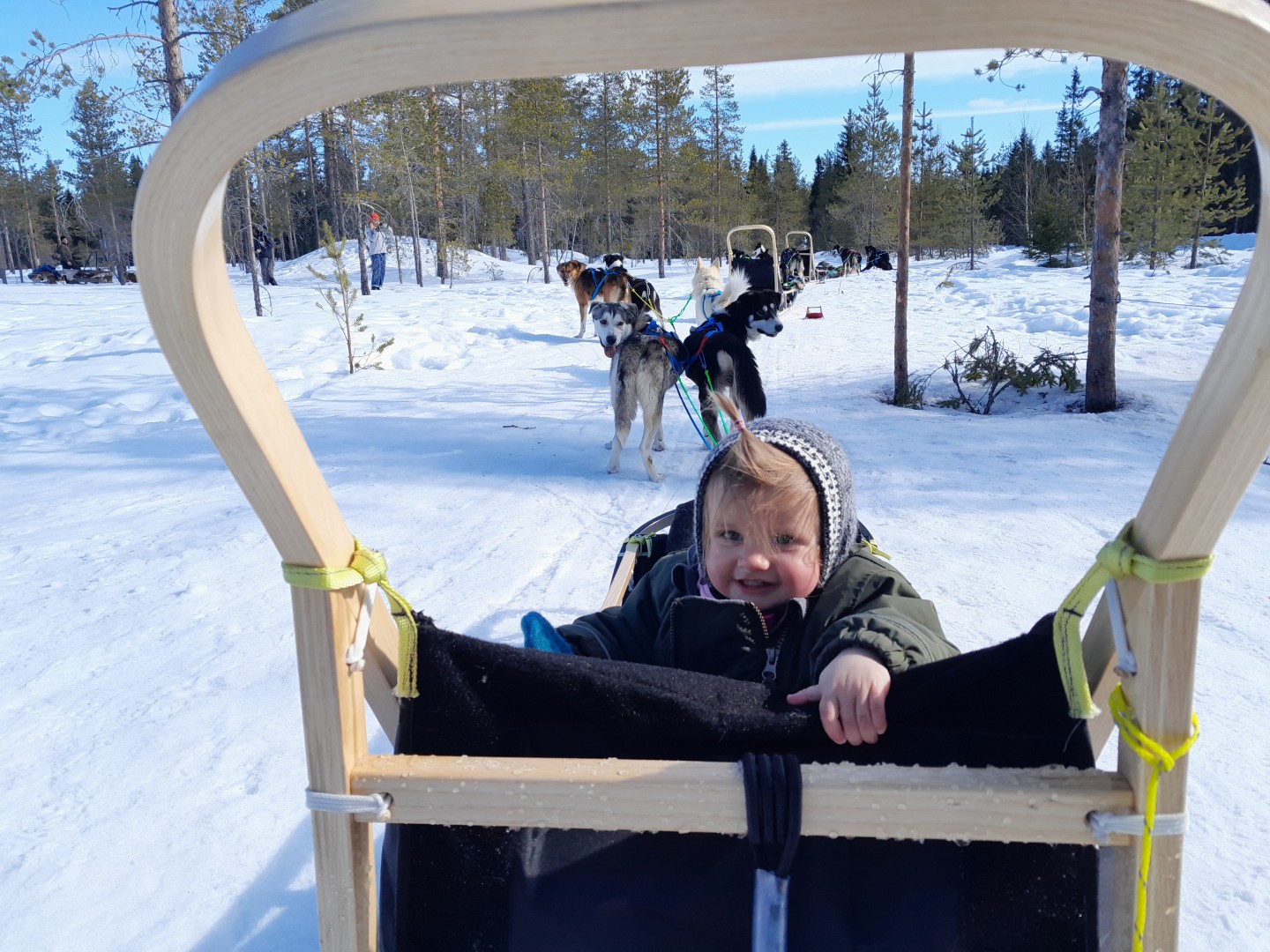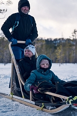 Suddenly, the barking stops, the adventure begins. The huskies pull your sled through the snowy forests and across the frozen lakes. One person sits at the front, taking beautiful photos, while the other stands at the back, steering the sled. It is possible to sit at the front together with your child…
