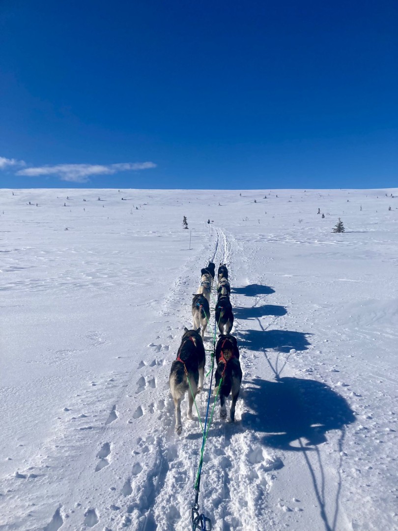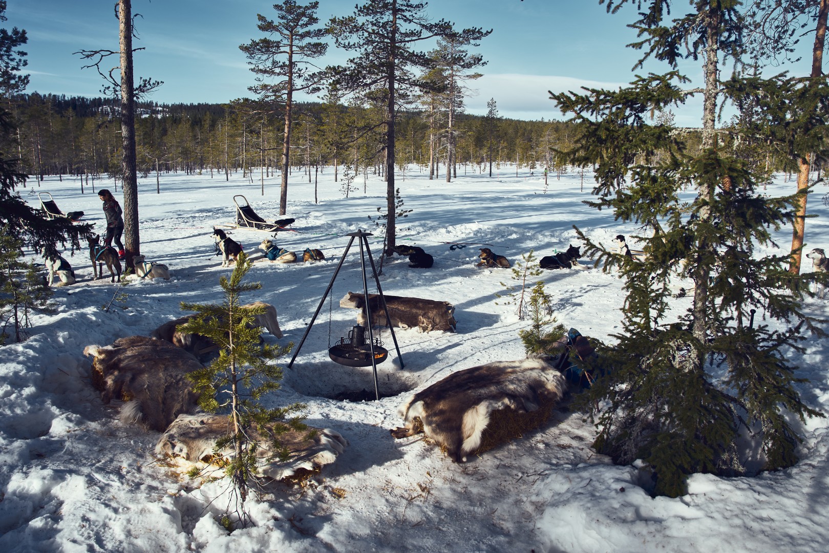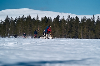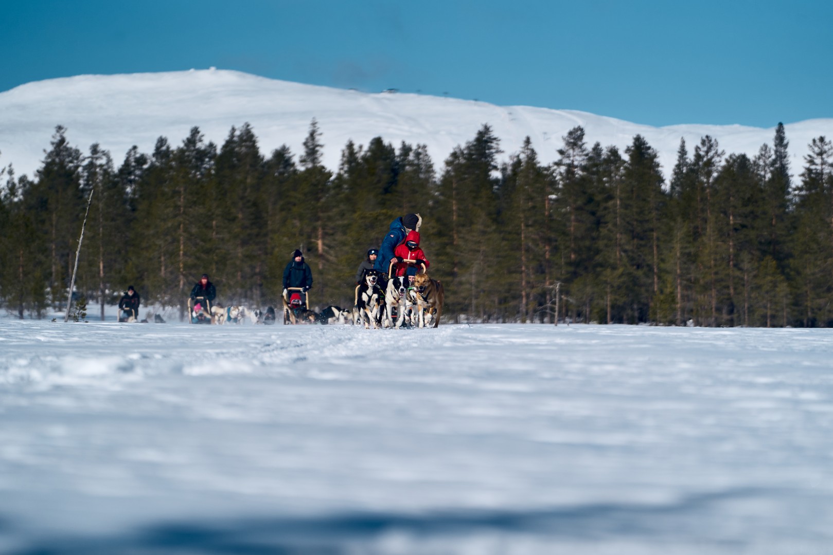 Suddenly, the barking stops, the adventure begins. The huskies pull your sled through the snowy forests and across the frozen lakes. One person sits at the front, taking beautiful photos, while the other stands at the back, steering the sled. It is possible to sit at the front together with your child…